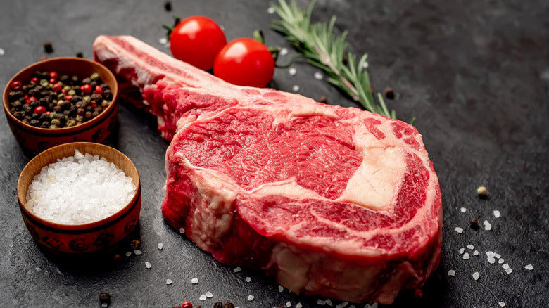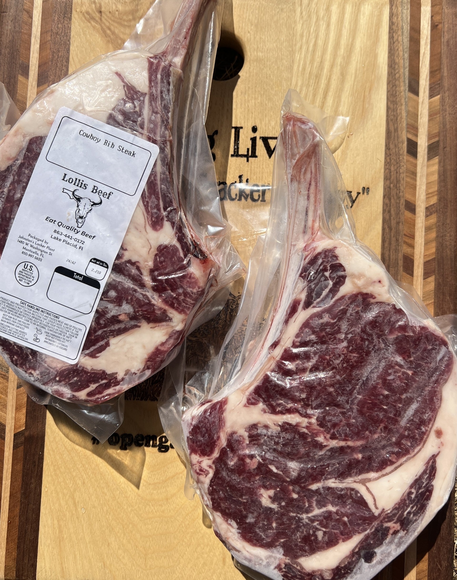Indulge in the bold, robust flavor of our Cowboy Cut Ribeye steak, a premium bone-in beef cut known for its exceptional marbling and tender juiciness.